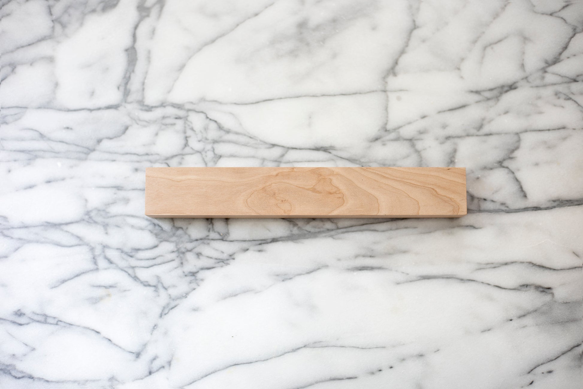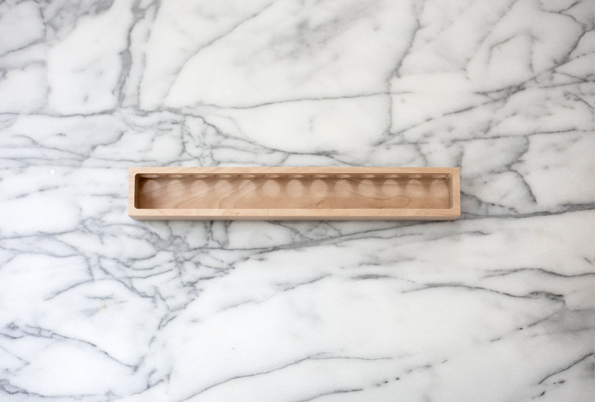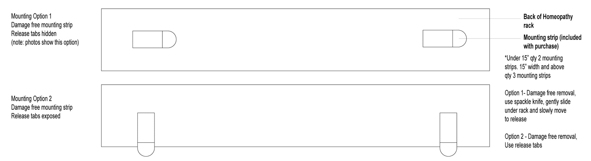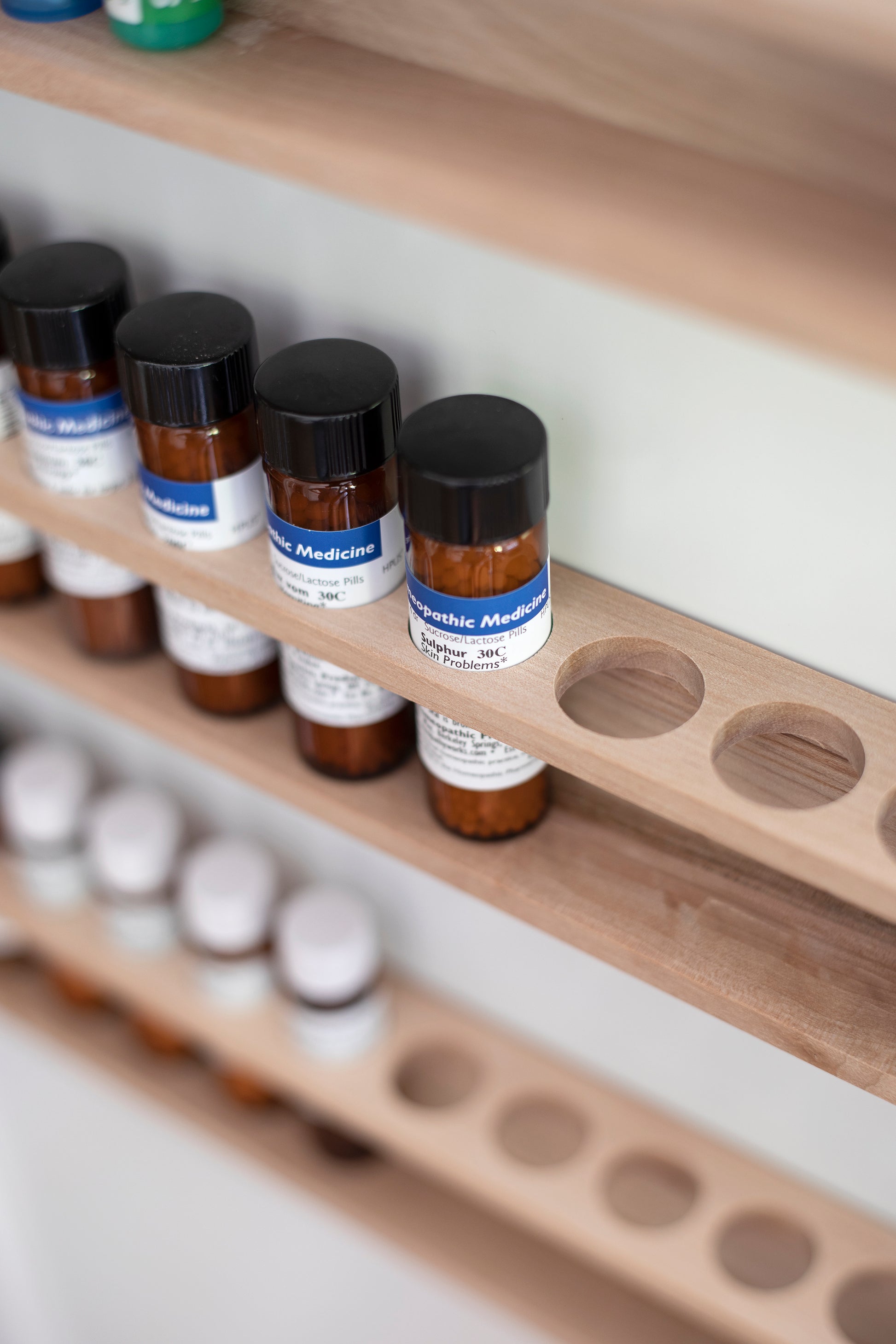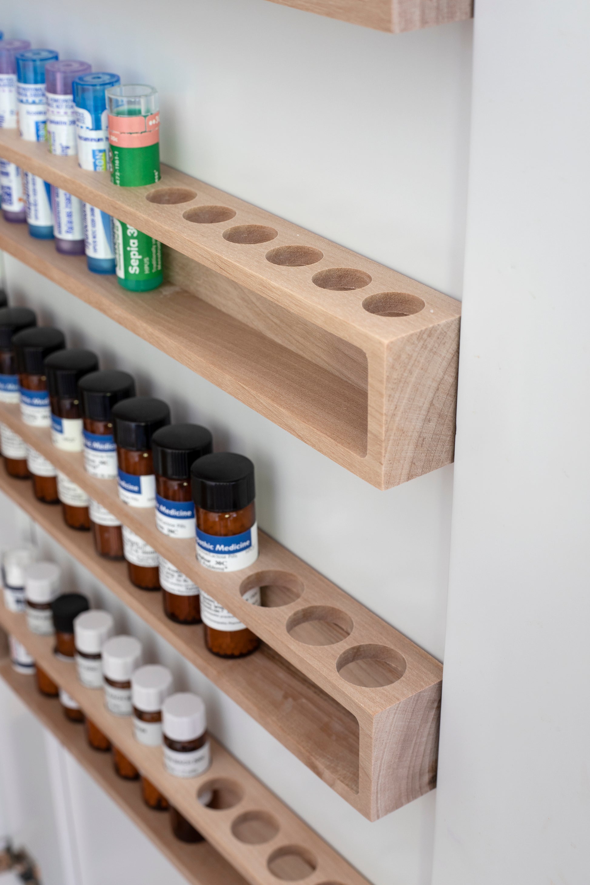 Solid birch unfinished wood homeopathy storage rack. To be mounted on back of cabinet door, smooth wall or any smooth surface. Each measure 1.75" h x 1.25" d x width (varies, see image) Price is for 1 rack.